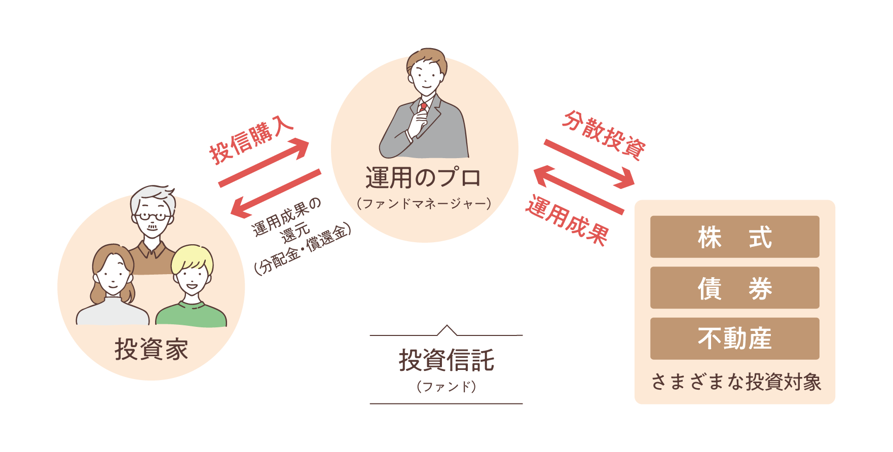 投資信託とは、多くの投資家から集めたお金をひとつの大きな資金としてまとめ、運用の専門家が株式や債券等に投資・運用を行う金融商品です。
