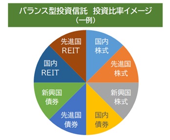 国内外の株式、債券、不動産投資信託(REIT)など複数の資産に分散投資する方法です。さまざまな投資対象それぞれに個別投資する場合はまとまった資金が必要になりますが、バランス型ファンド1つで複数の資産や地域に投資することができます。