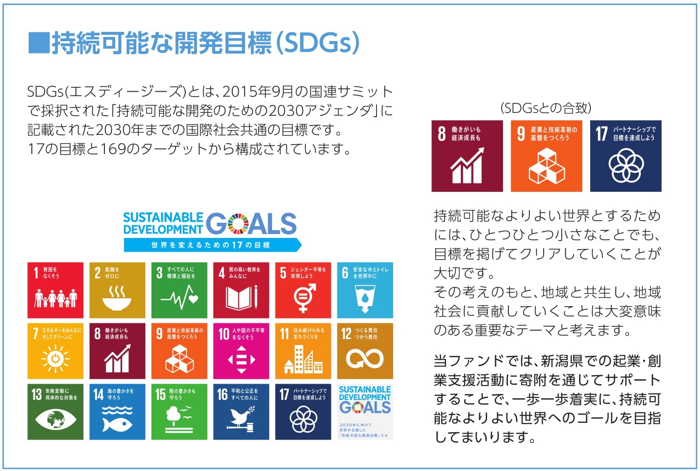 新潟県の起業・創業を応援することで、県内経済の活性化をめざし、将来の若者が安心して働ける未来づくりを応援します。また、さまざまな方面とパートナーシップをとり、新潟県の職づくり・企業・経済の発展に貢献していきます。