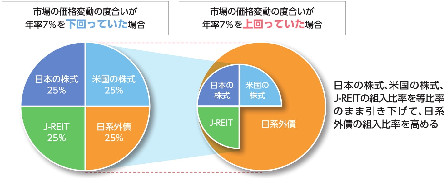 - 一方、市場の価格変動の度合いが目途とする水準(年率7%相当)を上回っていた場合は、相対的に価格変動が大きな日本の株式、米国の株式、J-REITの組入比率を等比率のまま引き下げて、日系外債の組入比率を高めます。