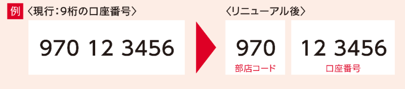 現行では口座番号を半角数字9桁でご入力いただいておりますが、リニューアル後は、部店コード(半角数字3桁)と口座番号(半角数字6桁)に分けてご入力いただきます。