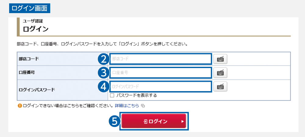 ② 部店コード、③ 口座番号、④ ログインパスワードを入力し、⑤