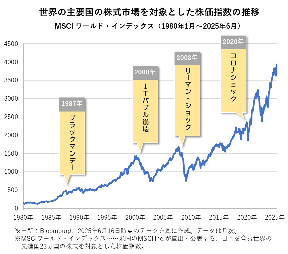 過去、世界ではさまざまな場面で金融危機・経済危機がありましたが、長期で見るとその後は世界経済の成長に伴って回復し、上昇してきた傾向がわかります。