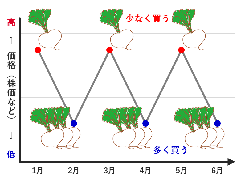 積立投資で、定期的に一定金額ずつ同じ金融商品を購入する投資手法を「ドルコスト平均法」といいます。この手法では、価格が安い時は多く買う、価格が高い時は少ない数量を自動的に購入することになり、平均購入単価を低くする効果が期待できます。